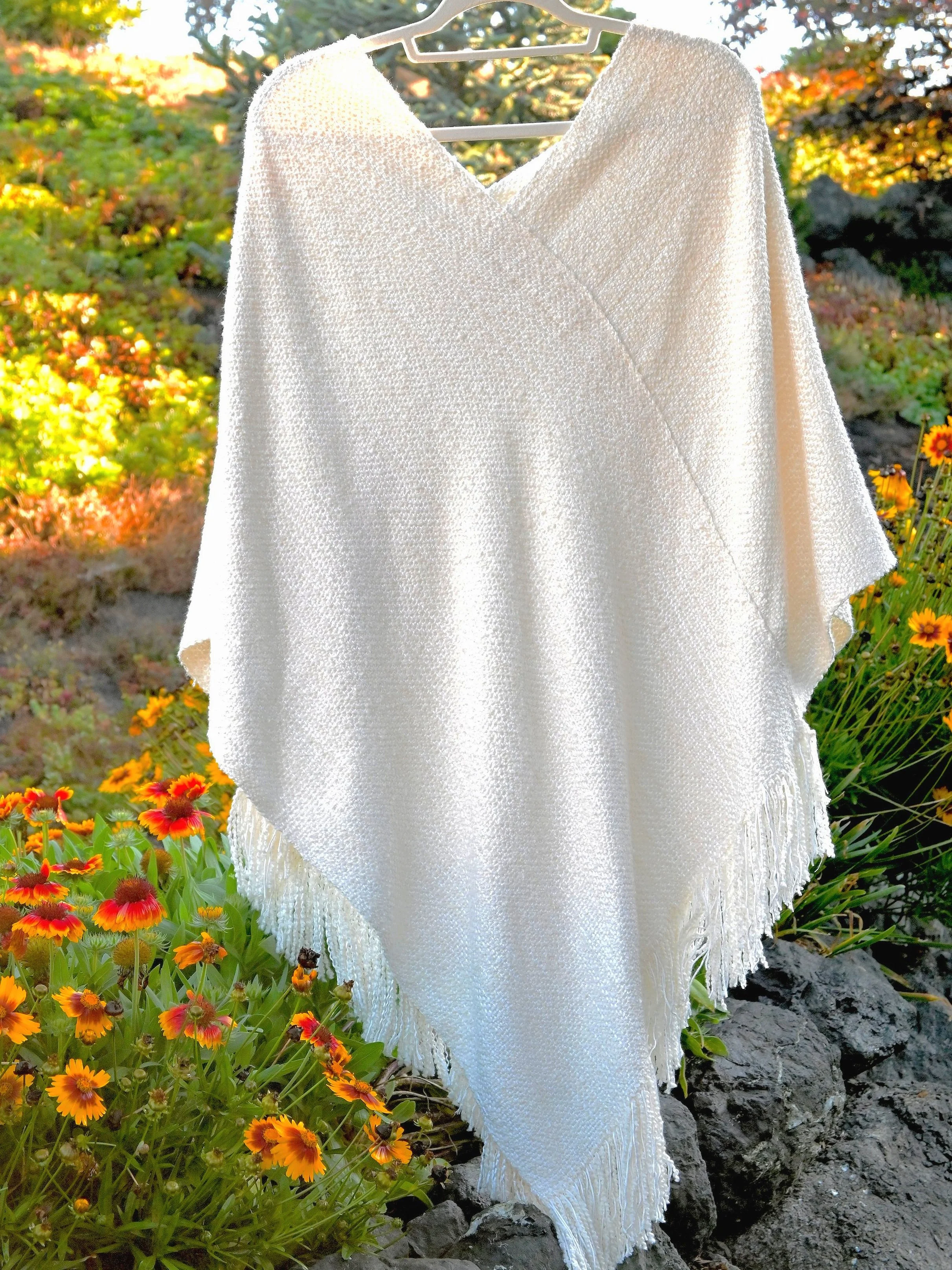 This one of a kind ultra soft Poncho/Shawl is made from Cashmere, Organic Cotton and Bamboo. It is luxuriously soft with a buttery feel. The ivory and white blend create a delicate look that can easily dress up a special occasion outfit or provide that extra layer of warmth and comfort to everyday casual wear. This Poncho/Shawl is so soft you won't want to take it off!